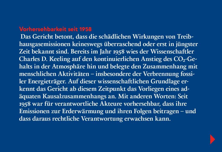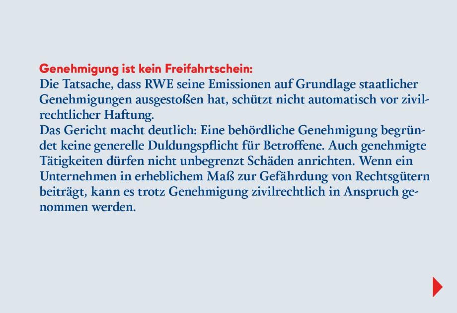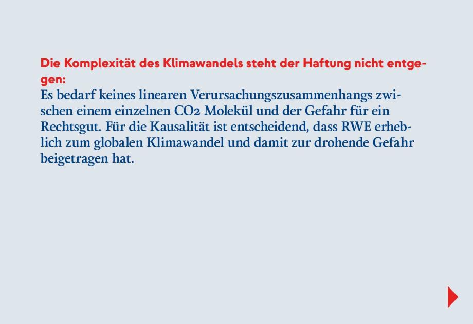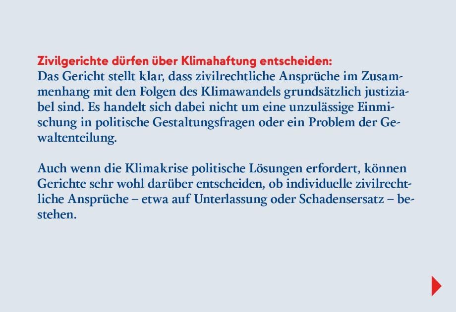 Mit diesem Beschluss schrieb das Gericht Rechtsgeschichte! Erstmals hat ein Gericht bejaht, dass prinzipiell ein privates Unternehmen für seinen Anteil an der Verursachung klimabedingter Schäden verantwortlich ist. Dies gilt dann, wenn ein Anteil konkreter Schäden oder Risiken für Privatpersonen oder ihr Eigentum den Aktivitäten des Unternehmens zugeordnet werden kann.