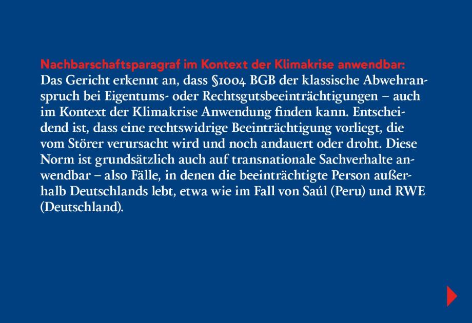 Im Fall RWE hat das OLG Hamm entschieden, dass der Klimawandel mit seinen grenzüberschreitenden Auswirkungen eine Art globales Nachbarschaftsverhältnis herbeigeführt hat, sodass der Paragraf 1004 auch hier gilt. In diesem Fall sind es ungefähr 10.000 Kilometer Luftlinie, die der Hauptsitz von RWE in Essen vom Kläger Saúl Luciano Lliuya in den peruanischen Anden trennt. In zahlreichen anderen Ländern wie zum Beispiel Großbritannien, den Niederlanden, USA oder in Japan gibt es ganz ähnliche rechtliche Voraussetzungen, auf die sich Betroffene berufen können.