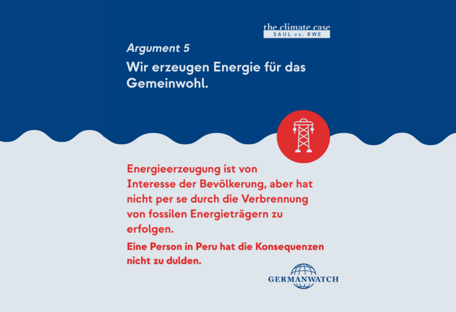 Am 24. November 2015 reichte der Bergführer und Bauer Saúl Luciano Lliuya, vor einem deutschen Zivilgericht eine Klage gegen den Energiekonzern RWE ein. Sein Haus ist durch eine Flutwelle des anwachsenden Gletschersees Palcacocha bedroht. Die Ursache dafür ist der Klimawandel, den RWE durch sein Geschäftsmodell mitverursacht.